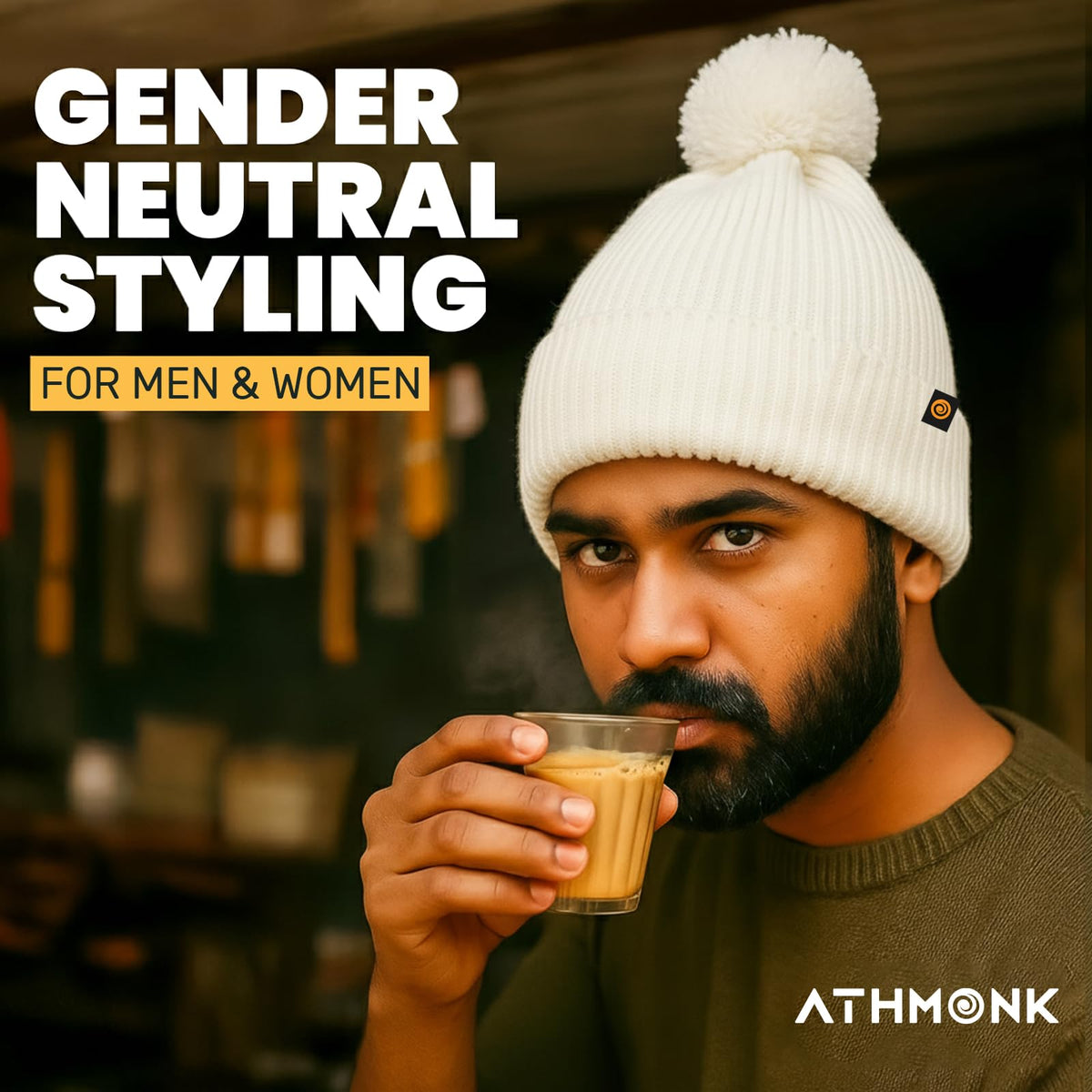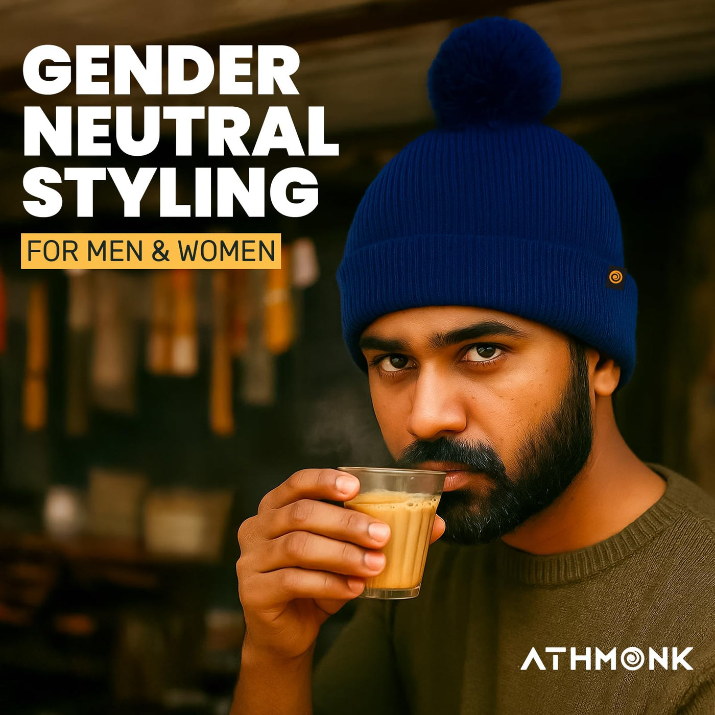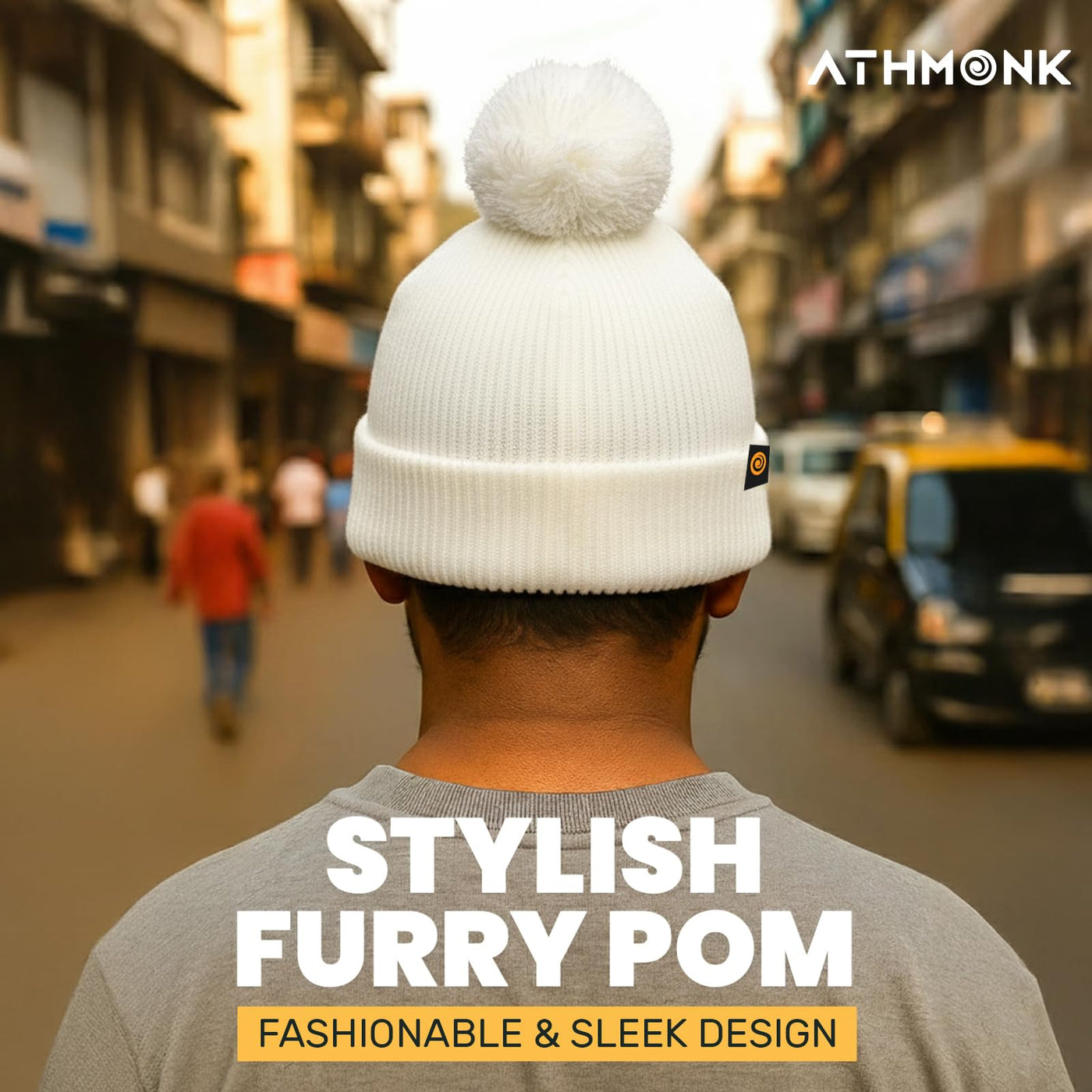 Athmonk Winter Woolen Beanie Cap for Men & Women with Pom | Stylish Head Cap for Winters | Cold Weather Hat for Girls & Boys | 100% Woollen Fabric Ultra Soft & Cozy | Garam Topi for Man | - White