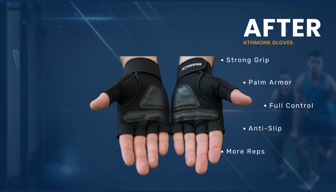 Athmonk gym gloves men are designed to enhance your grip and protect your hands during heavy lifting and CrossFit. The gloves feature padded palms and anti-slip silicone grips to ensure secure handling of weights or pull-up bars. These sweat-resistant workout gloves for men and women keep your hands dry and comfortable, allowing you to push through longer sessions. The fingerless design ensures maximum mobility while still offering full palm protection. Perfect for lifting, deadlifts, and intense gym workouts, these gloves improve performance and reduce the risk of blisters.